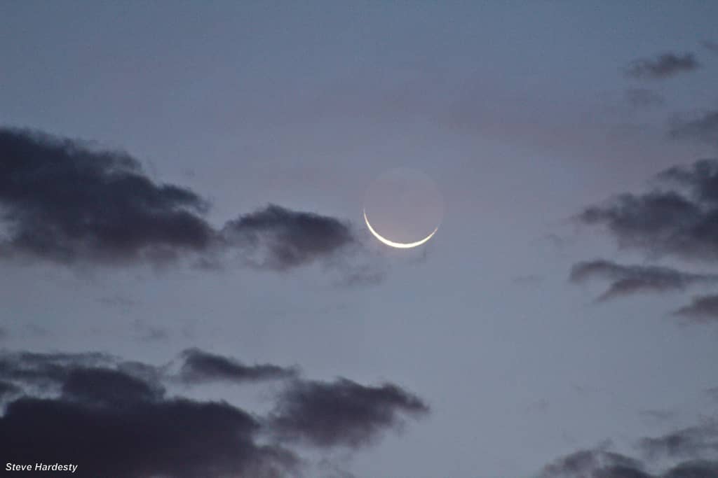 Allah’s peace, mercy, His blessings and the Bliss of His goodly-pleasure be upon you my beloved best foremost supporters and the entire ones from among Muslims who if they knew the Truth they would follow it. Here are some images of the crescent for month of Muharram at dawn of Tuesday the twenty-eighth of Dhul Hijja and also (some images of) the crescent of Muharram in the state of overtaking while the sun to the east of it, and we will certainly first show you: The image of the crescent of last month Dhul Hijja at dawn of Monday in order for you to look at the horns of the crescent of last month (Dhul Hijja) at dawn of Monday the 27th of Dhul Hijja for last month as follows: